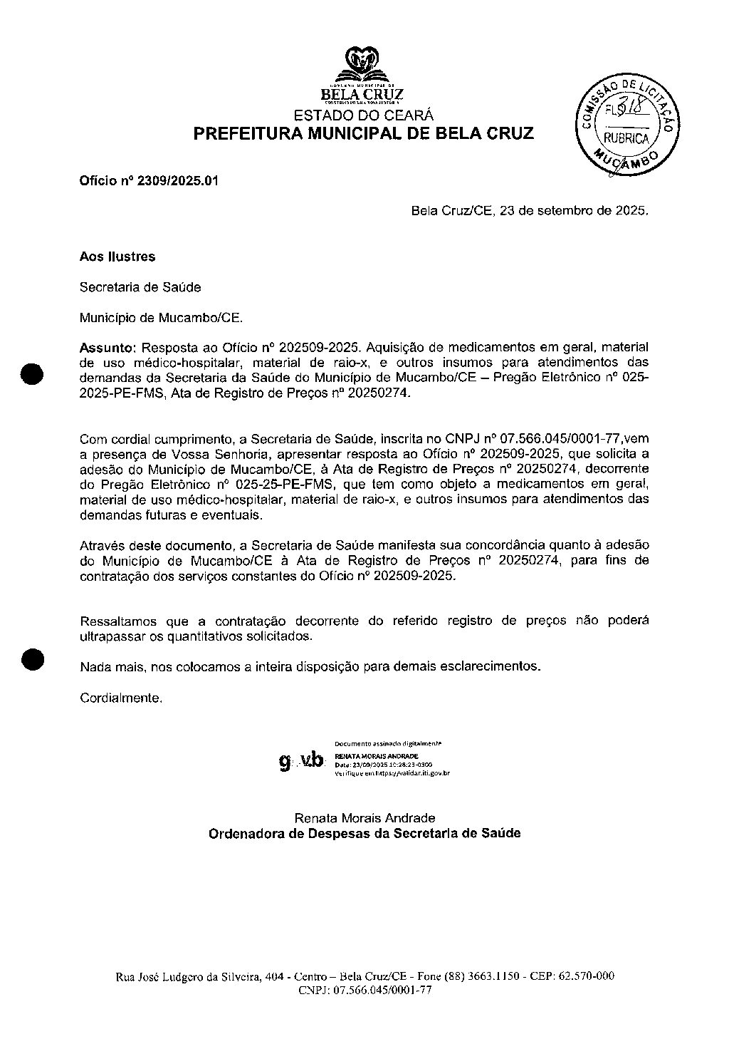 OFÍCIO DO MUNICÍPIO DE BELA CRUZ AO MUNICÍPIO DE MUCAMBO
