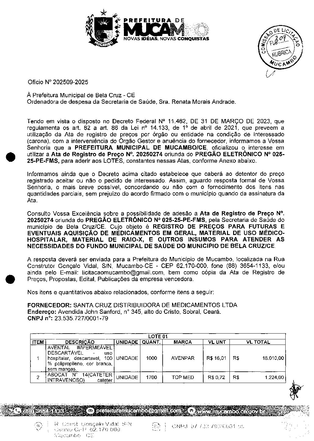 OFÍCIO DO MUNICÍPIO DE MUCAMBO AO MUNICÍPIO DE BELA CRUZ