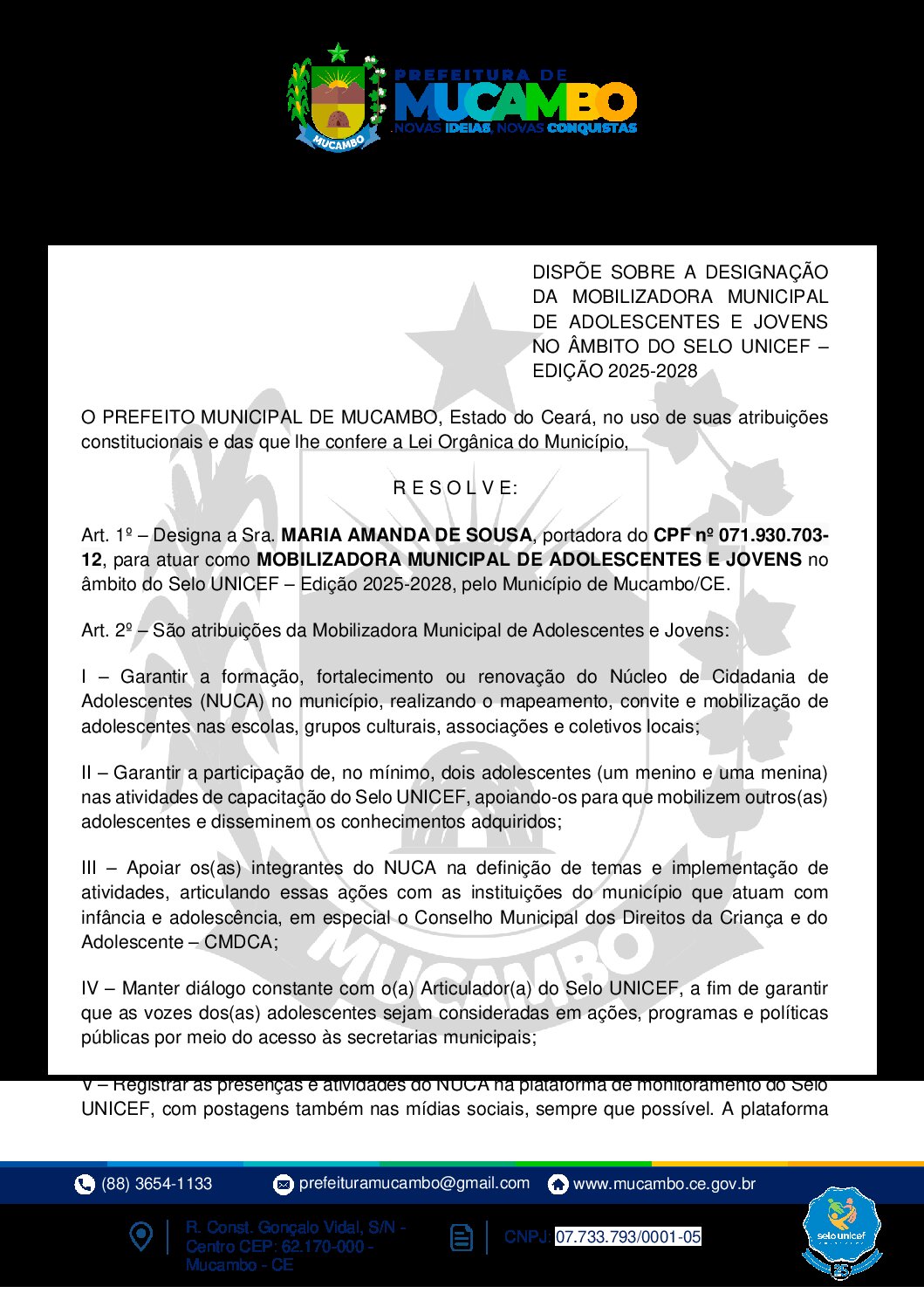 PORTARIA DE DESIGINAÇÃO SELO UNICEF – MARIA AMANDA DE SOUSA