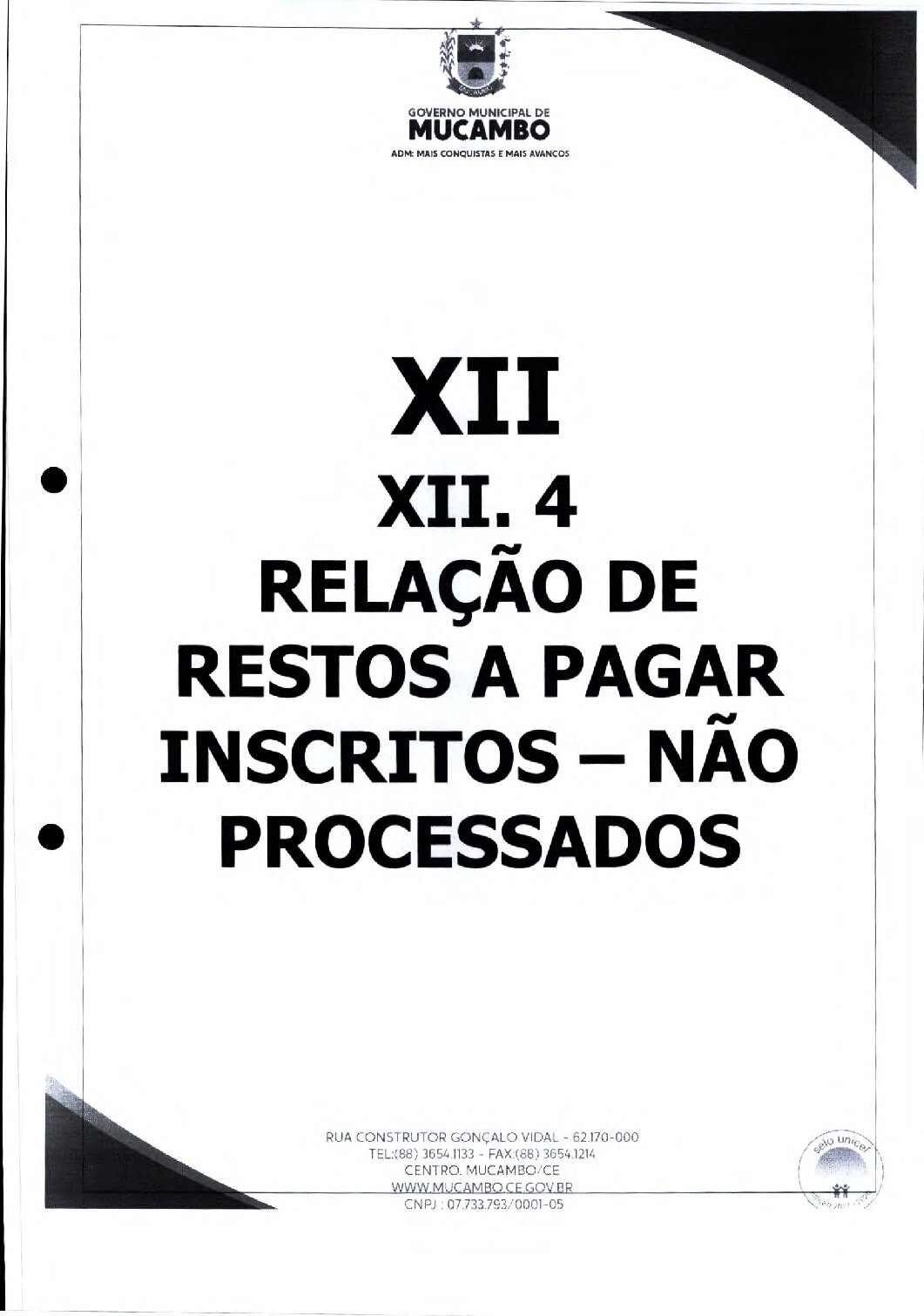 ITEM XII – RELACAO DE RESTOS A PAGAR NAO PROCESSADO